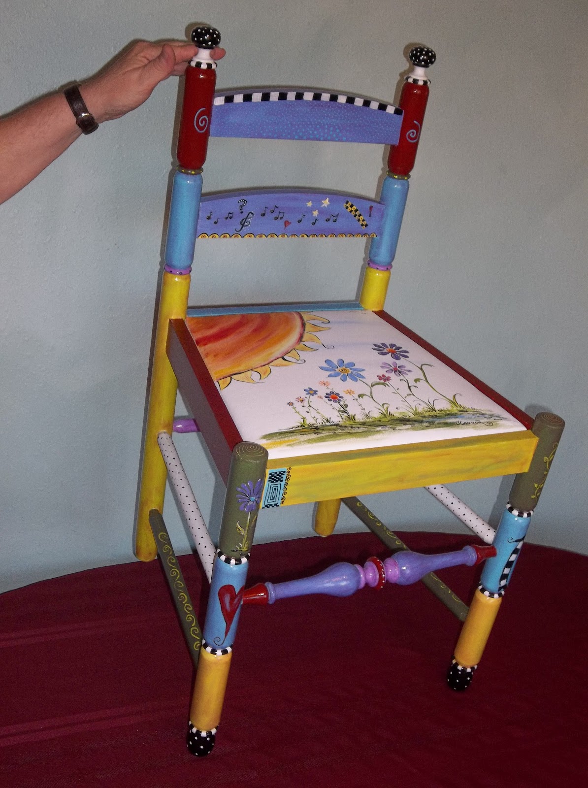 This is a picture of the chairs I had on display at Noyes Art Gallery. If you look around, you will find some old chairs that are sound, but in need of a face lift. I painted the canvas seats that cover two of the chairs. To start, just sand all the shiny off of them if they are stained and varnished. Then put a coat of primer on, after it has dried start painting! Remember, you can always paint over it if you don't like it, so don't worry about making a mistake. If you purchased your chair from a thrift store or